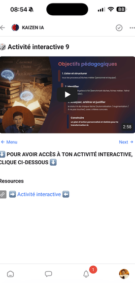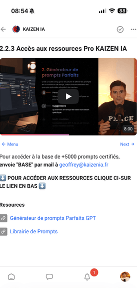 Vidéos studio, activités pratiques, cas d’usage concrets, projets guidés et livrables activables : tout est pensé pour que chaque étape produise une avancée réelle dans votre activité, et pas seulement une meilleure compréhension théorique.