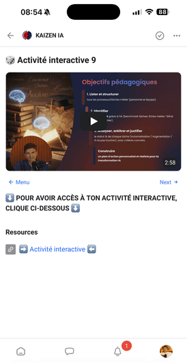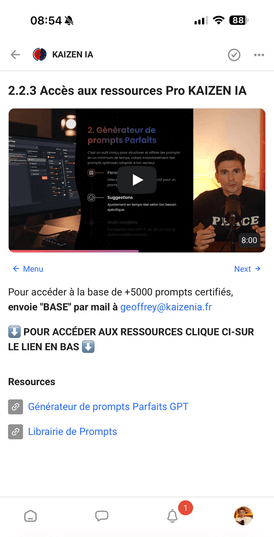 Vidéos studio, activités pratiques, cas d’usage concrets, projets guidés et livrables activables : tout est pensé pour que chaque étape produise une avancée réelle dans votre activité, et pas seulement une meilleure compréhension théorique.
